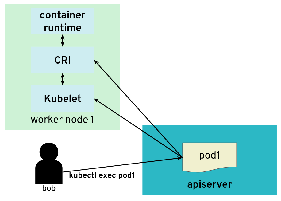 However, there are exceptions. Some kubectl commands will trigger the API server to open a new connection to the kubelet. kubectl exec is one of those commands. In order to get the standard I/Os from the pod, the API server will start an HTTP connection to the kubelet on the worker node where the pod is running. Depending on the container runtime used, it can be done in different ways, but one way to do it is for the kubelet to reply with a HTTP-302 redirection to the Container Runtime Interface (CRI). Basically, the kubelet is telling the API server to get the streams from CRI itself directly instead of forwarding. The redirection from the kubelet will only change the port and path from the URL; the IP address will not be changed because the kubelet and the CRI component run on the same worker node.